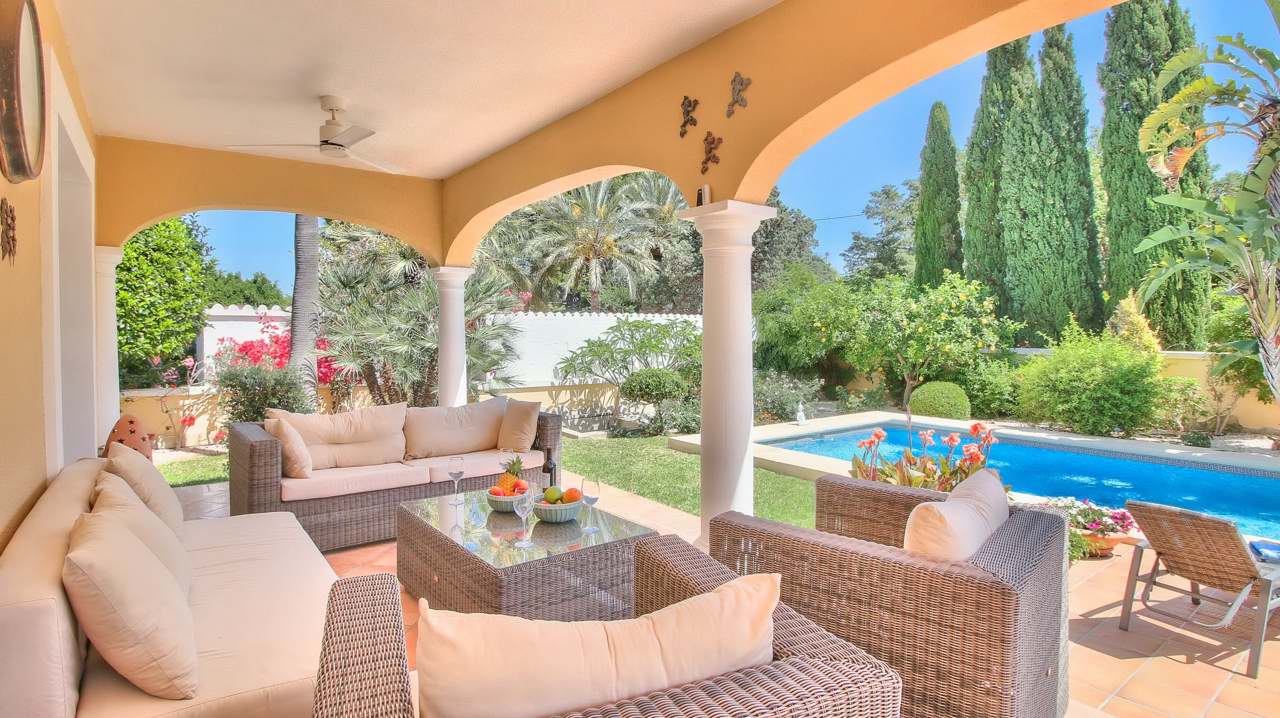 Gepflegtes, klimatisierbares Chalet mit eigenem Pool am Fuße des Berges Montgo in der Villengegend Tosal Gros in Denia, nur 3 km vom Strand entfernt, auf einem 811 qm grossem Privatgrundstück mit einem schön angelegtem Garten, mit Palmen, Rasenfläche und schattigen Bereichen. Es kann genutzt werden von 6 Erwachsenen und 4 Kindern. Der Privatpool ist zum bequemen Ein- und Ausstieg mit einer römischen Treppe ausgestattet. Sonnenliegen und ein Sonnenschirm laden zum Entspannen ein. Eine großzügige Grillterrasse mit gemauertem Aussengrill, Spüle, Kühlschrank und Sitzgarnitur zu gemütlichen Grillabenden ein. Eine Überdachung über dem Tisch sorgt für Schatten.