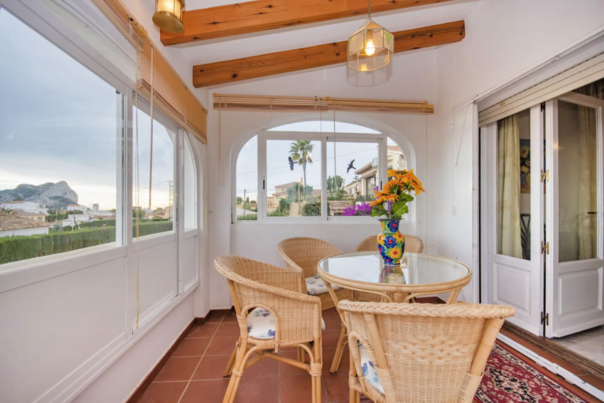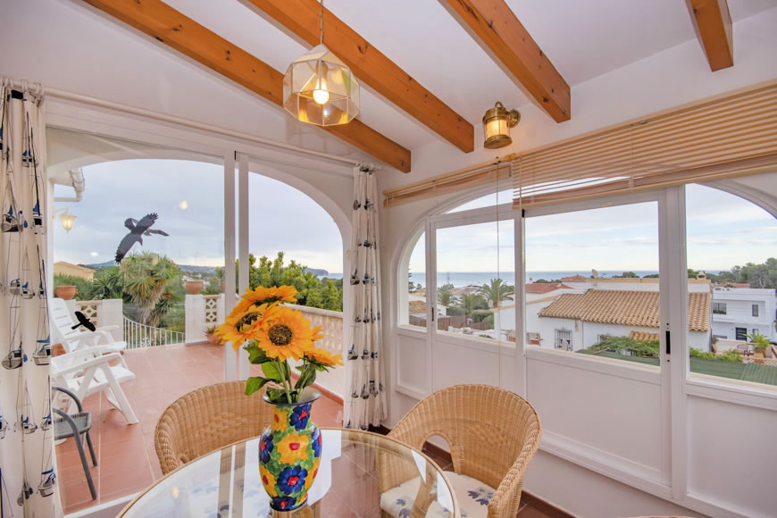 - verglaste Hausterrasse mit Sitzgruppe und Meerblick