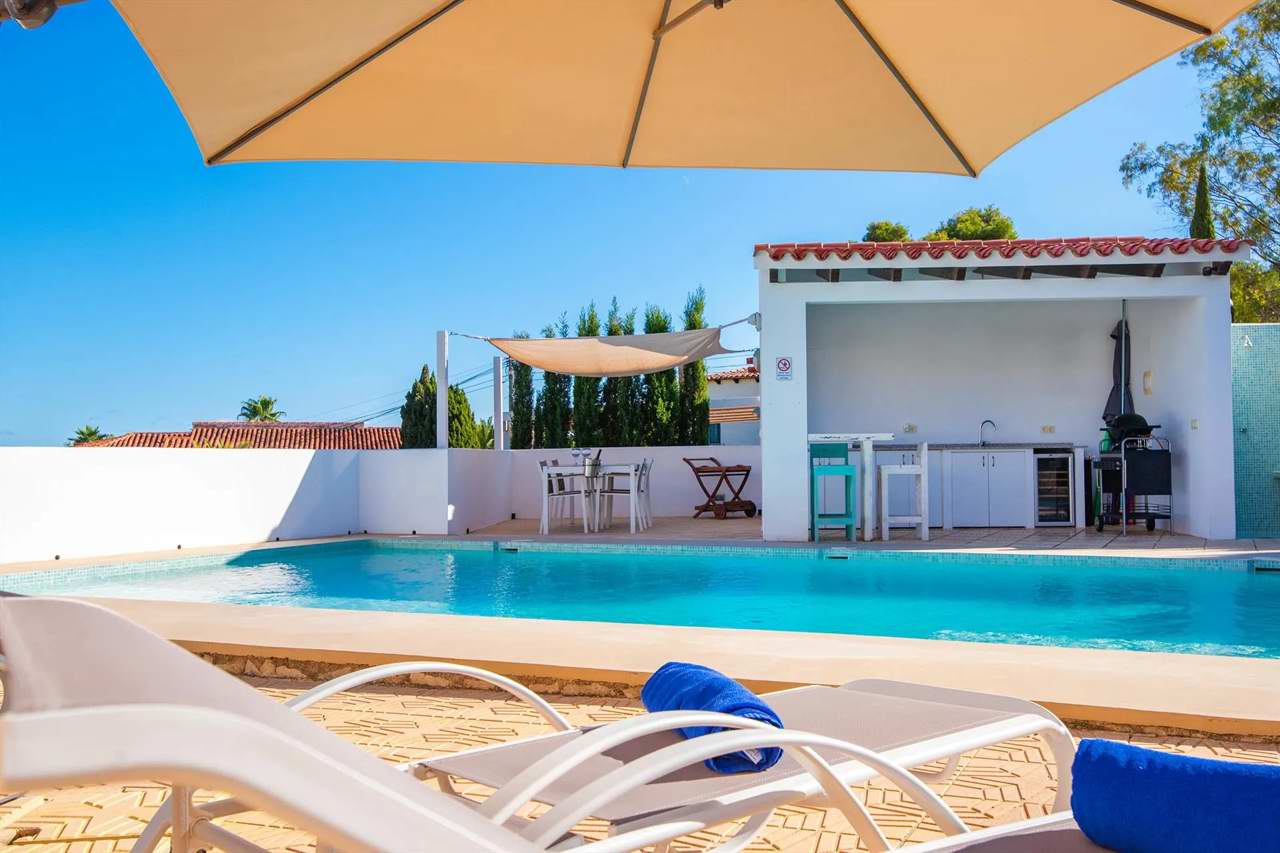 Sie ist errichtet auf einem 1.040 qm großen, umzäunten Grundstück. Zu Ihrer Verfügung stehen unterschiedliche Terrassen mit Aussengrill, Panoramaterrasse auf dem Dach und eine Aussendusche für die kurze Abkühlung zwischendurch. Sonnenliegen stehen zur Entspannung bereit.