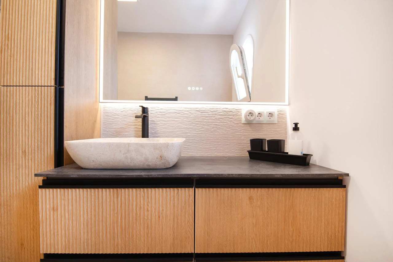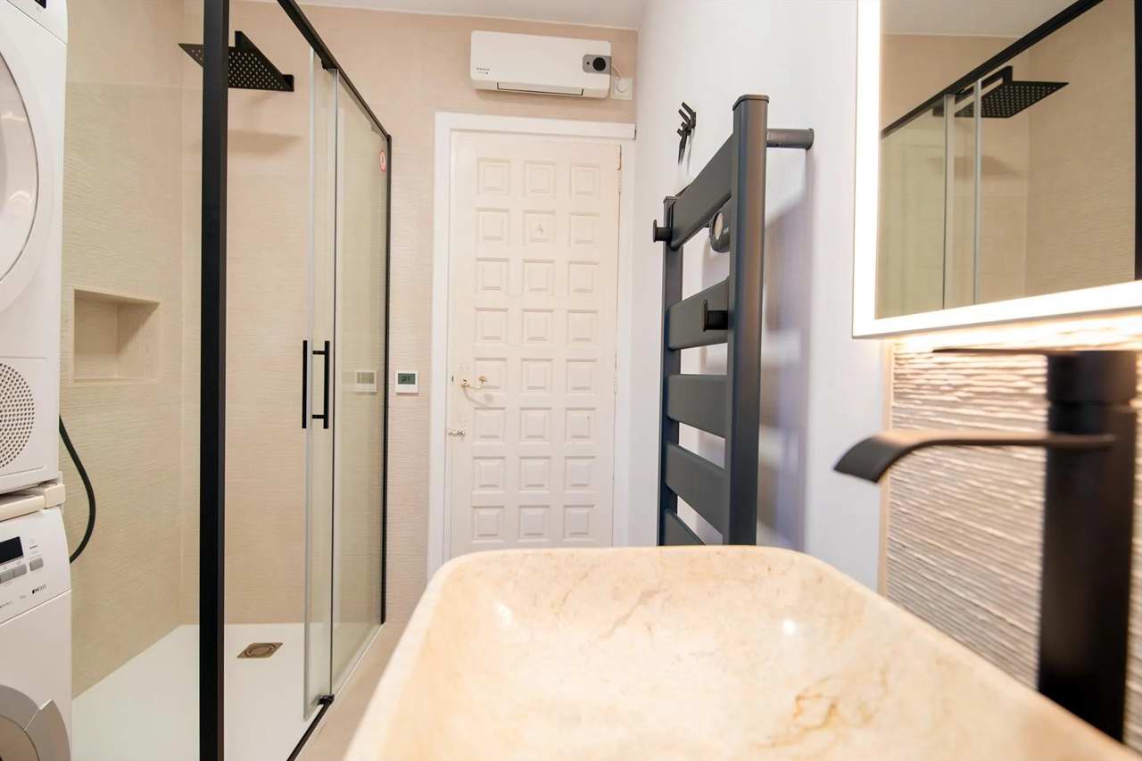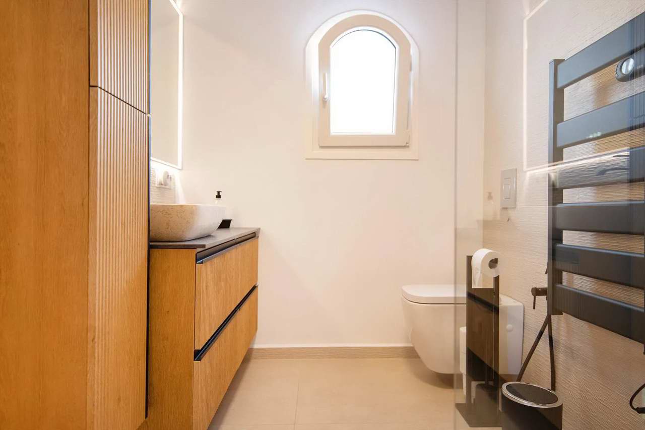 - Badezimmer mit Waschbecken, Dusche, Toilette und Haartrockner, Fußbodenheizung