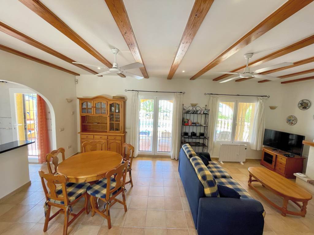 Freistehendes Ferienhaus am Ende einer Sackgasse mit einer Wohnfläche von 150 qm zur Alleinnutzung bis zu 6 Personen im Wohngebiet Cumbre del Sol in Benitachell bei Moraira an der Costa Blanca. Parkplätze für 2 Pkws befinden sich auf dem 885 qm grossem Privatgrundstück. Der eigene Privatpool hat eine Größe von 4 x 8 Metern und verfügt zum bequemen Einstieg über eine römische Treppe. Sonnenliegen laden auf der Poolterrasse zum Entspannen ein. Eine Aussendusche und ein Grill stehen bereit. Im hinteren Gartenbereich gibt es einen Picknickplatz und eine Bocciabahn.