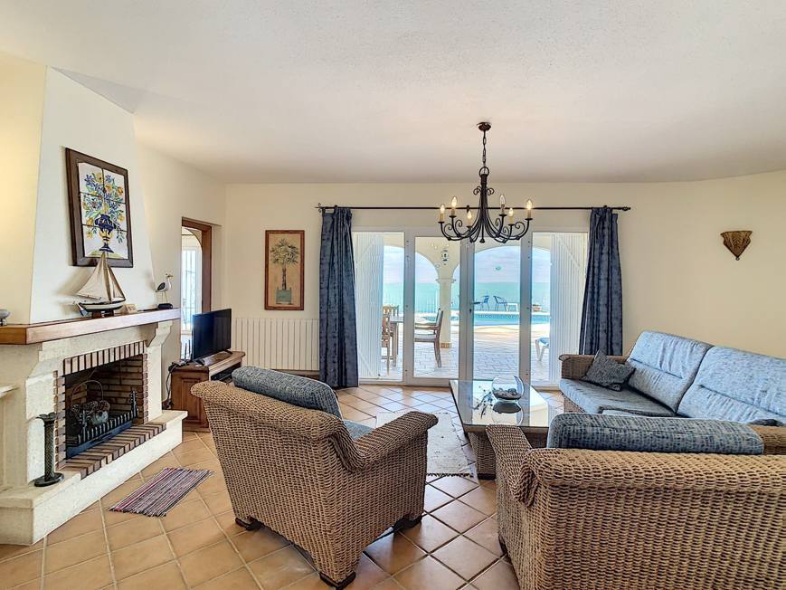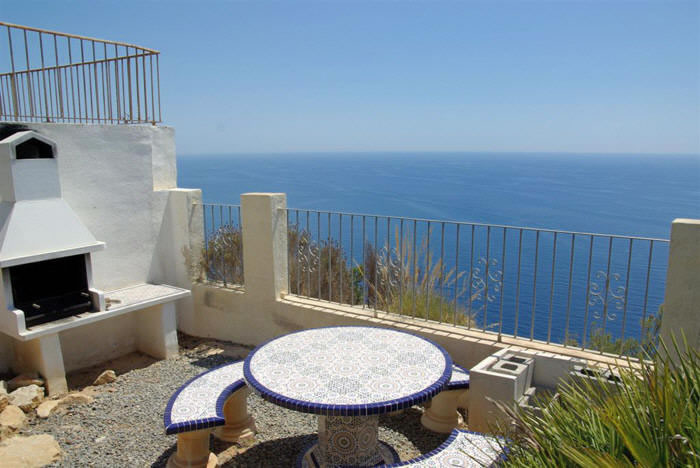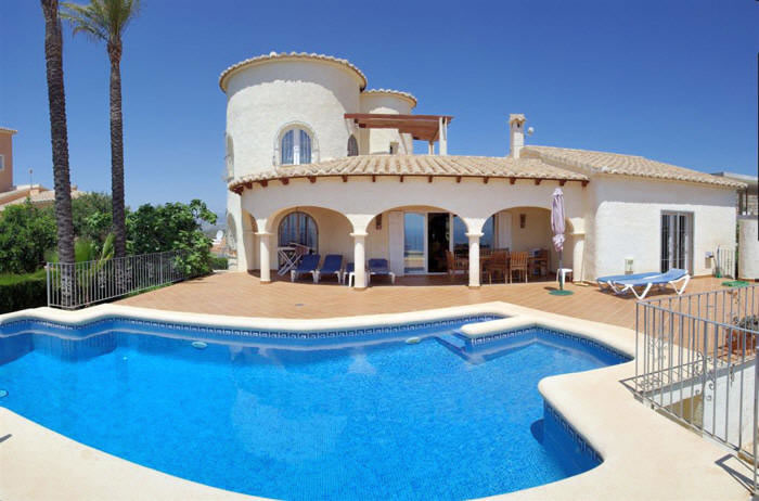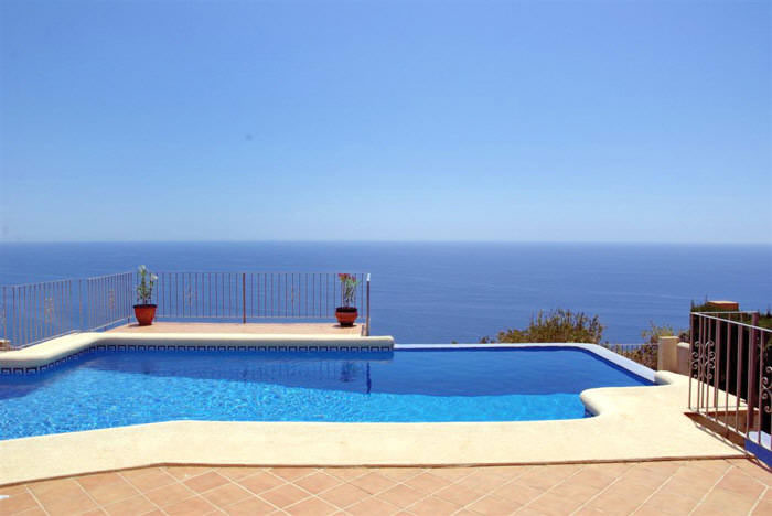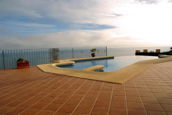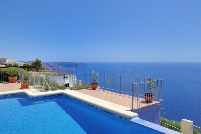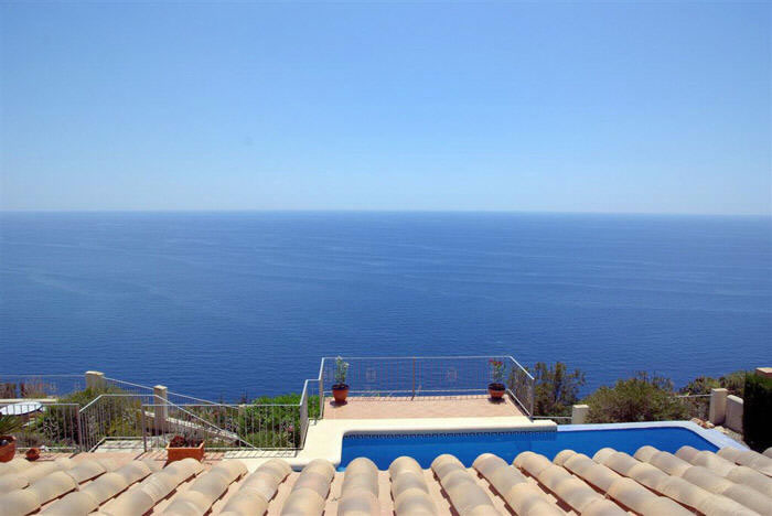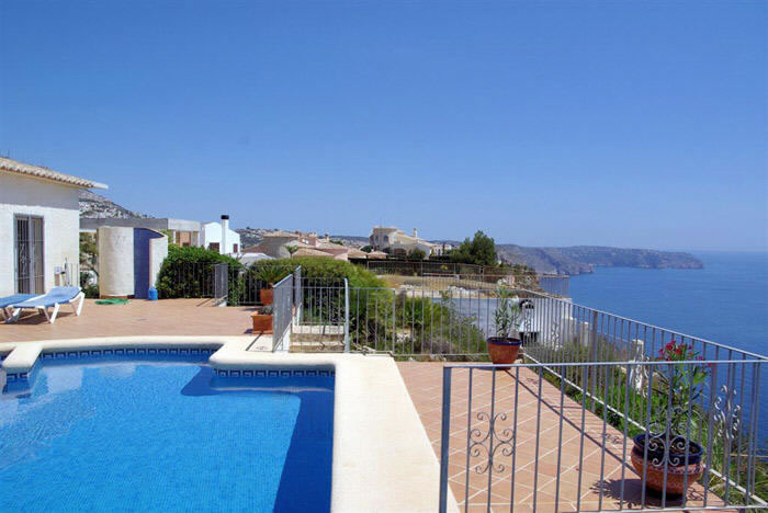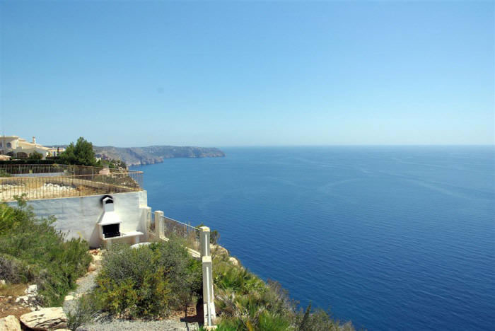 Freistehendes Ferienhaus in erster Meerlinie bis 8 Personen, in der Urbanisation La Cumbre del Sol in Benitachell bei Moraira an der Costa Blanca, nur 5 Km entfernt von der Strandbucht Cala Moraig. Hier bietet sich Ihnen ein atemberaubender Meer- und Panoramablick bis zum Cabo de la Nao in Javea. Für Ihren Pkw steht innerhalb des abgeschlossenen Grundstücks ein Parkplatz sowie 2 Garagen bereit. Der private Pool mit römischer Treppe hat eine Größe von 4 x 8 Metern und ist zusätzlich mit einem Überlauf ausgestattet, welcher den direkten Übergang ins Meer anspielt. Die angrenzende Sonnenterrasse ist mit sechs Sonnenliegen ausgestattet. Ein gemauerter Grill rundet das Außenleben ab. Das gesamte Anwesen verfügt über ein 1.229 qm großes Grundstück.